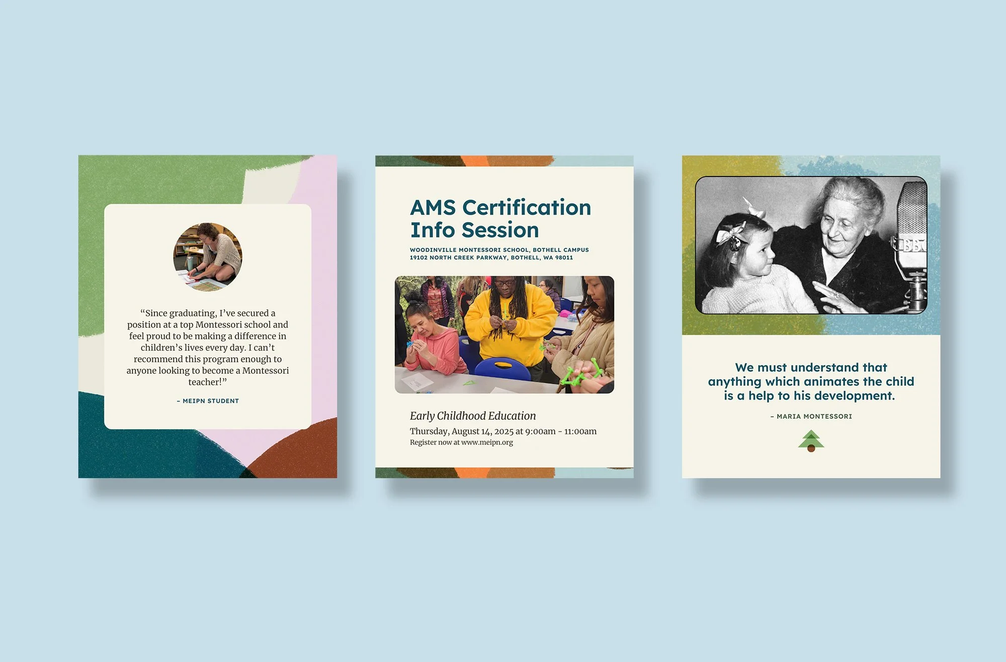 Our client, Montessori Education Institute of the Pacific Northwest, uses both original and stock photography (paired with custom-made patterns) to pay tribute to their past and present as a Montessori teaching school.