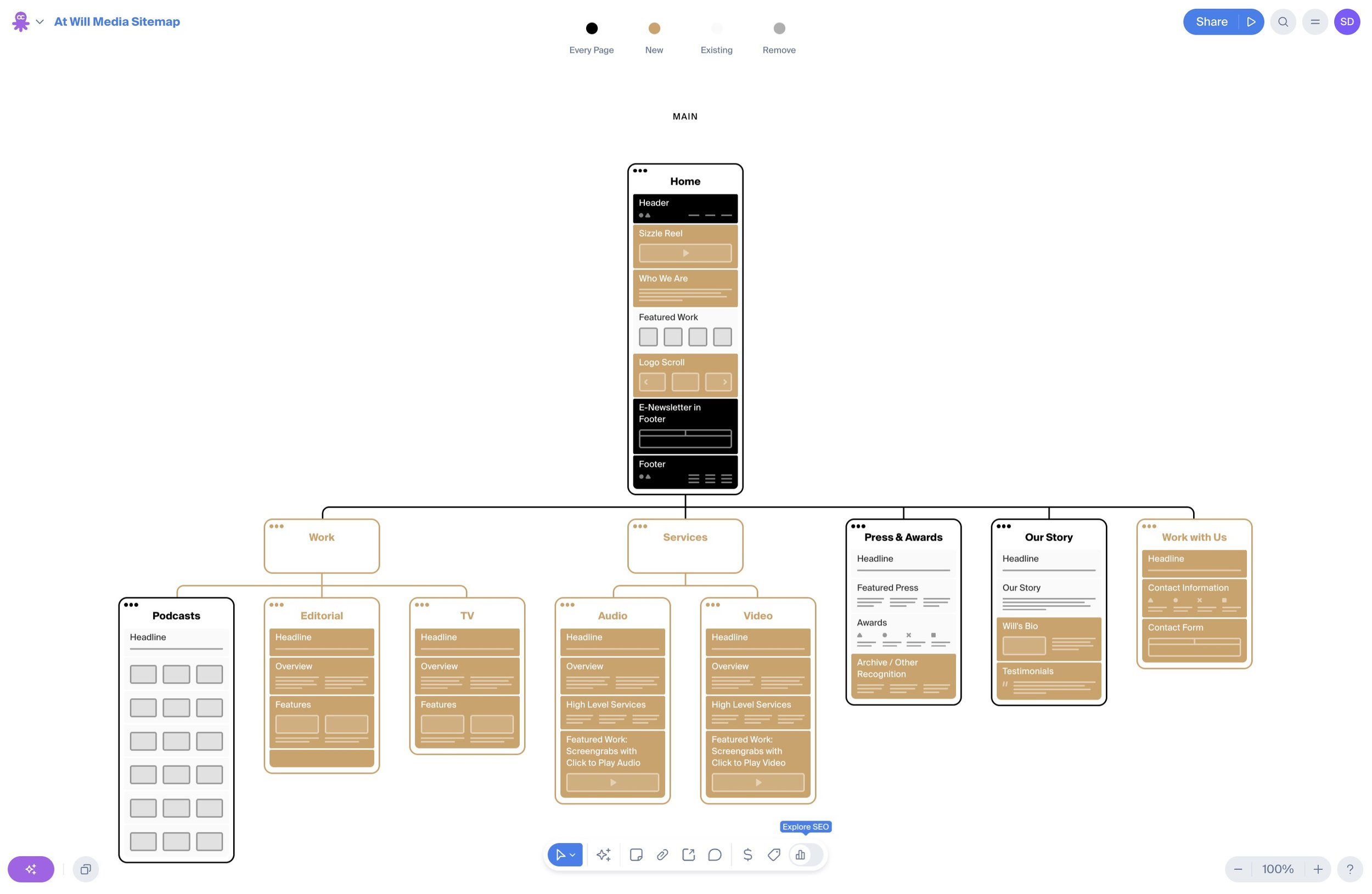 For this process, we use a program called Octopus. It helps us lay out all of the pages and page sections in a clear way. We can also easily modify the structure as we meet with our clients during their sitemap-focused meeting, the Content Strategy Session. We come into this meeting with a rough outline of what their sitemap might look like based on our findings in the Kick-off call. Then, we collaborate, talking through each page, which sections need to be added or taken away, and how we can improve the flow of the site. We complete this sitemaping process with the mindset of the end user. What will make sense to a first-time website visitor? How can we direct the user to inquire about our client's services or purchase a product? The sitemap is intended to answer these questions and guide website visitors to take a specific action, whether that be completing a form or making a purchase.